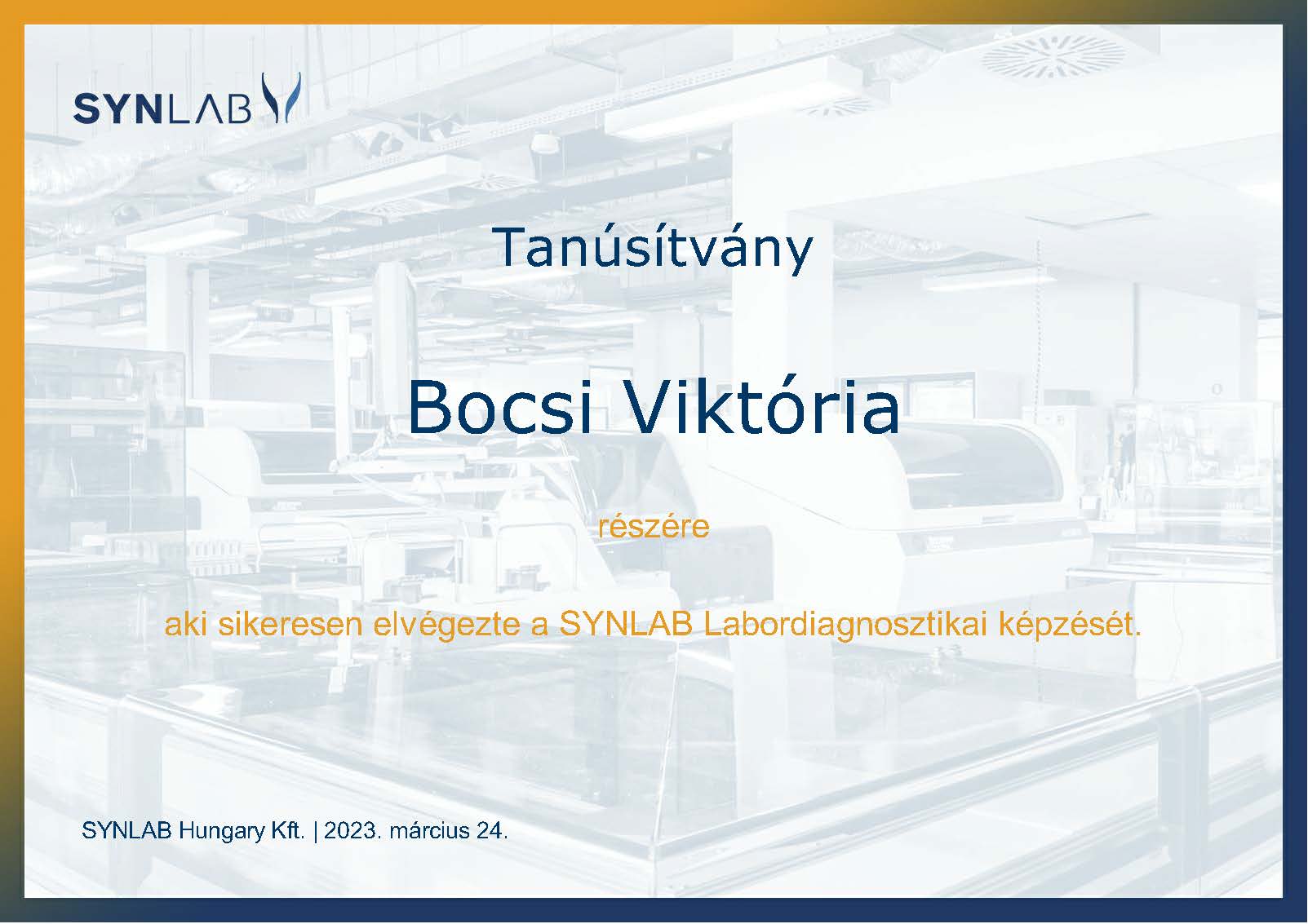 Sikeresen elvégeztem a SYNLAB Hungary Kft. által kínált labordiagnosztikai képzést, ahol korszerű laboratóriumi gyakorlatokat és elméleti tudást szereztem.