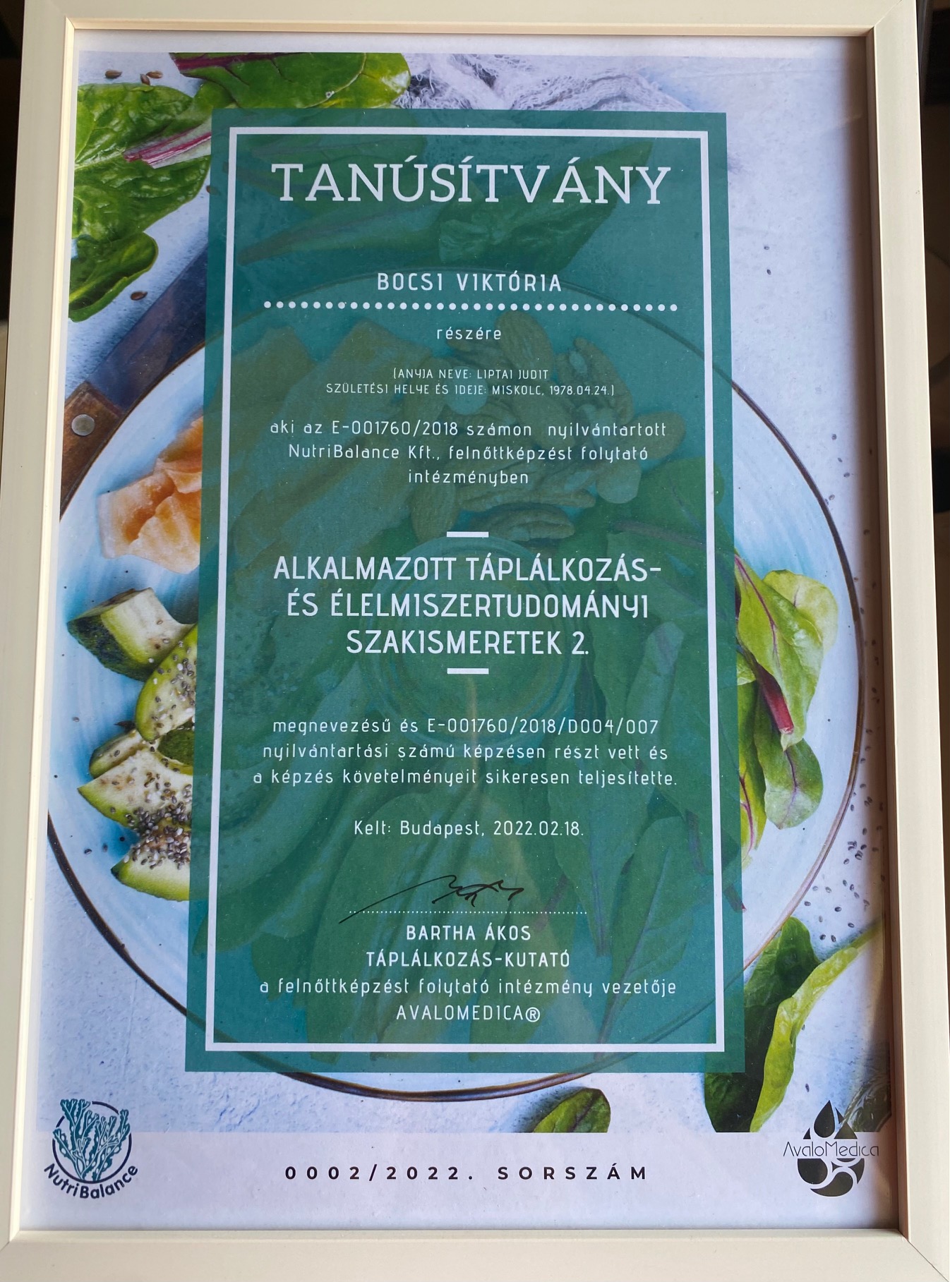 Ez a tanúsítvány igazolja, hogy részt vettem az Alkalmazott Táplálkozási Ismeretek 2 képzésen, és sikeresen teljesítettem a képzés követelményeit.