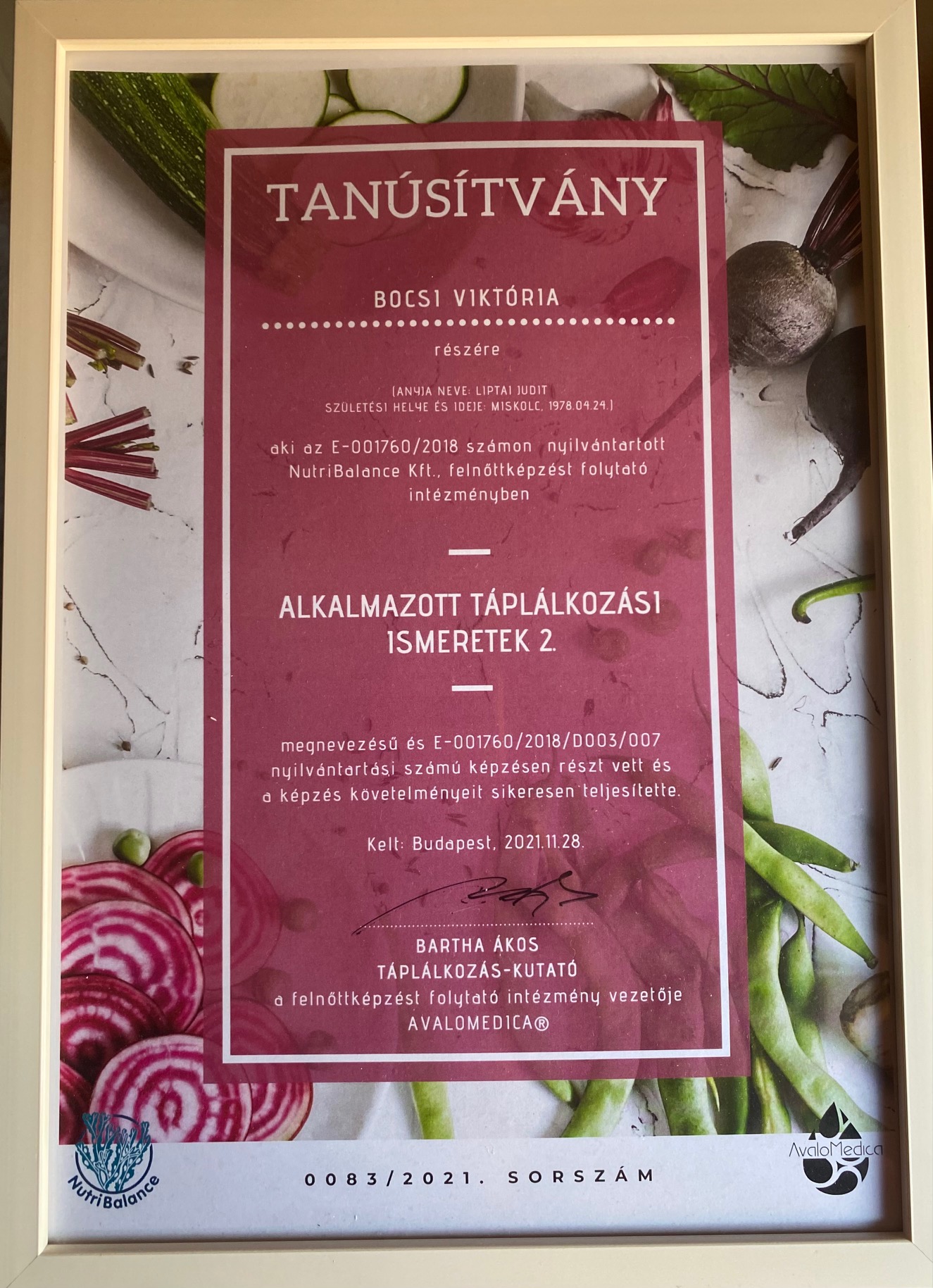 A képzés során megerősítettem táplálkozási és élelmiszertudományi ismereteimet, ami hozzájárult szakmai fejlődésemhez és a gyakorlati alkalmazáshoz.
